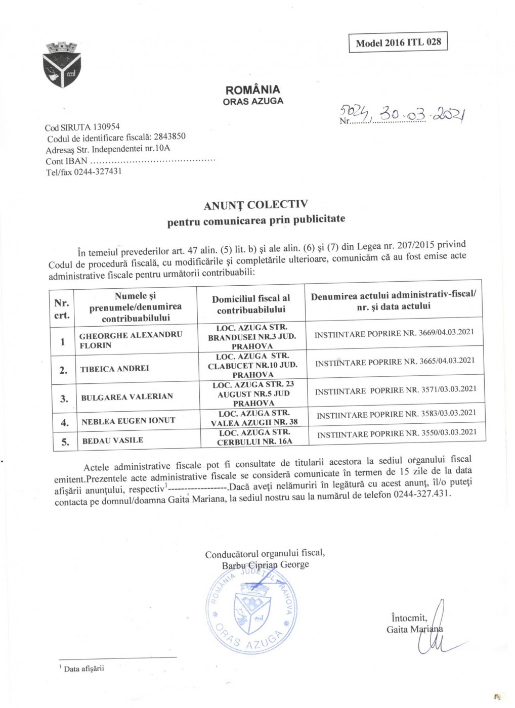 BIROUL ELECTORAL de circumscripție AZUGA - INFORMĂRI, APRILIE 2024