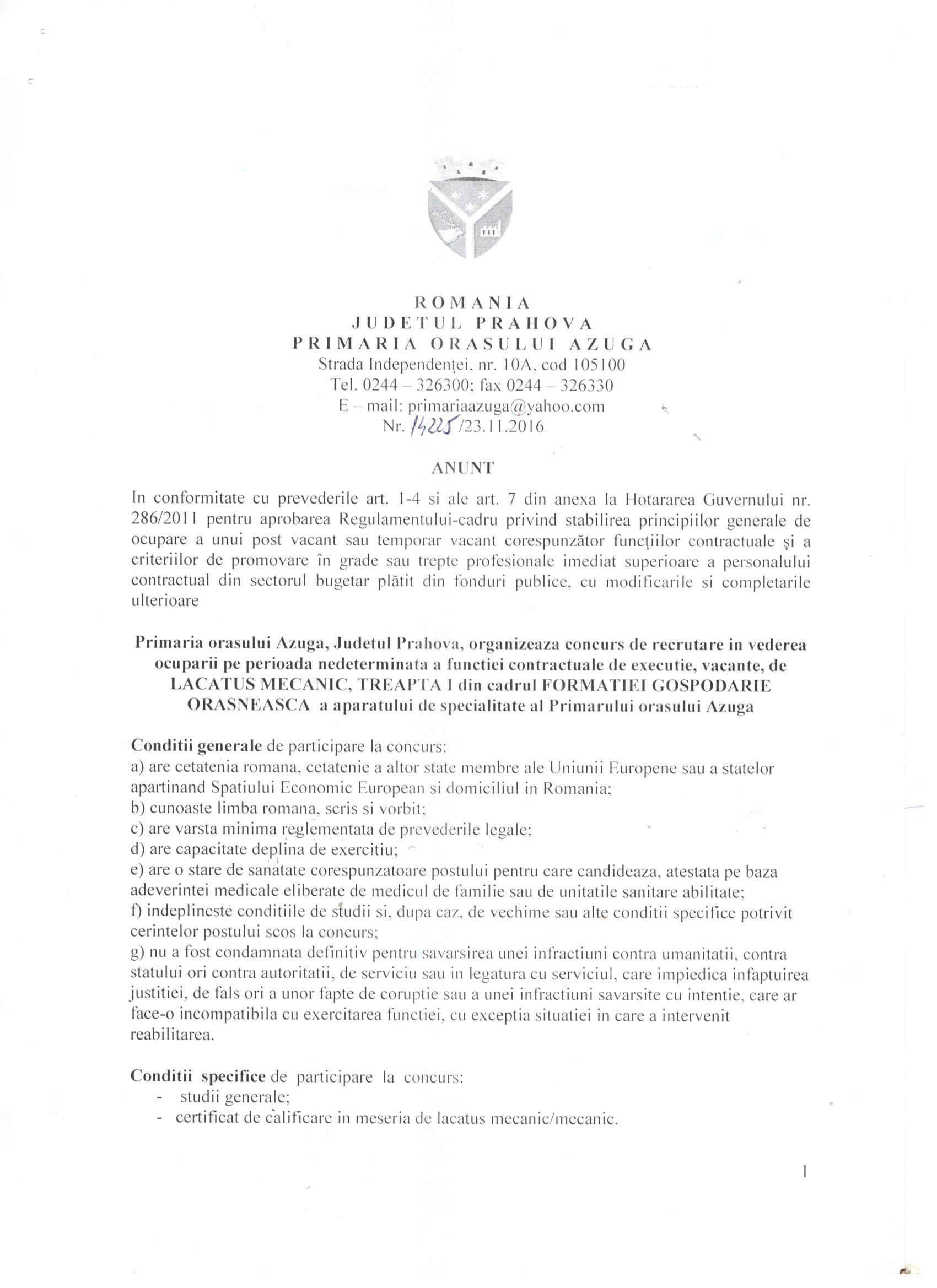 Anunt disponibilitate colaborare cu medic primar voluntar in cadrul Compartimentului Asistenta medicala Scoala Primara