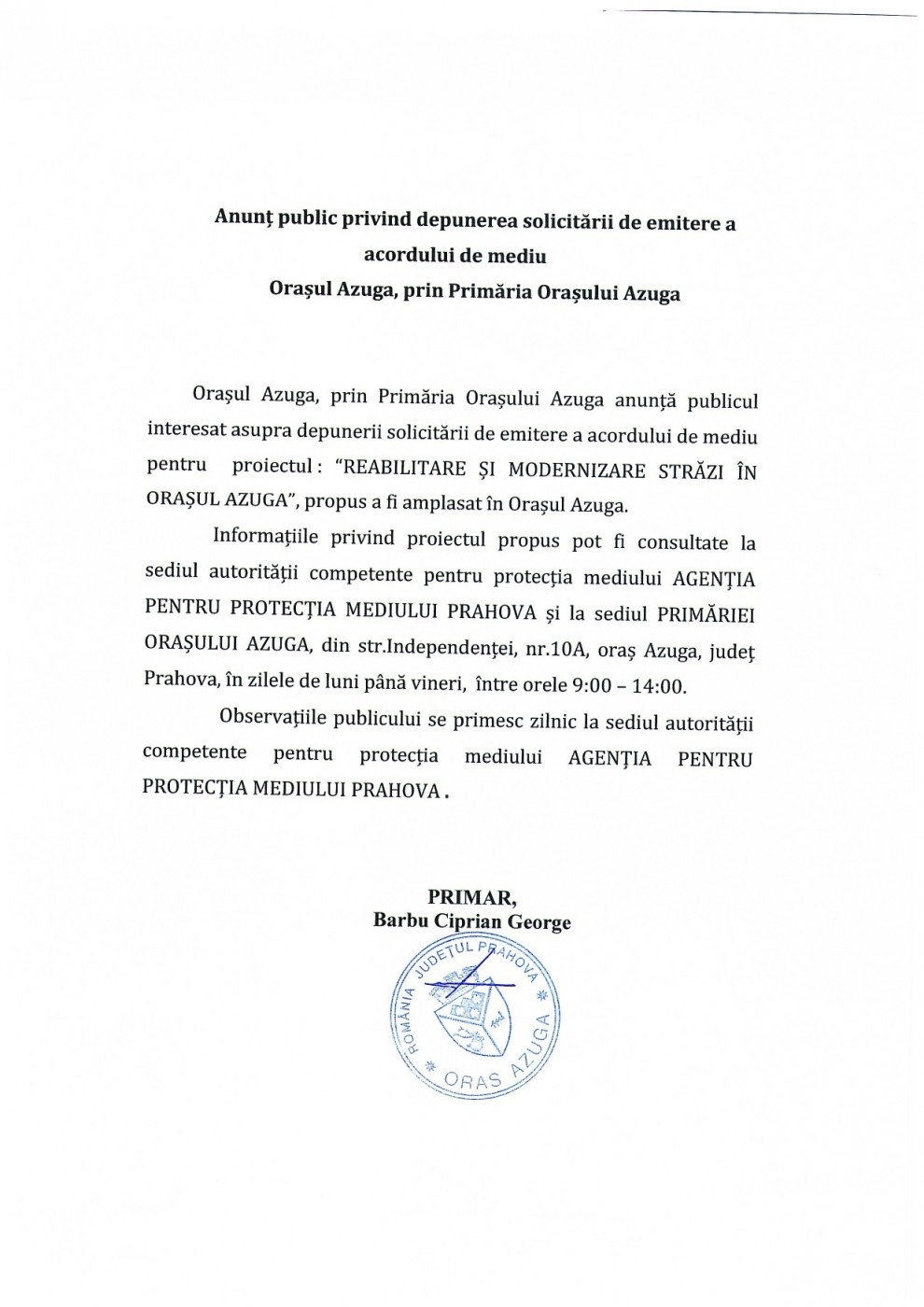 Anunț public privind depunerea solicitării de emitere a acordului de mediu pentru proiectul "REABILITARE ȘI MODERNIZARE STRĂZI ÎN ORAȘUL AZUGA"