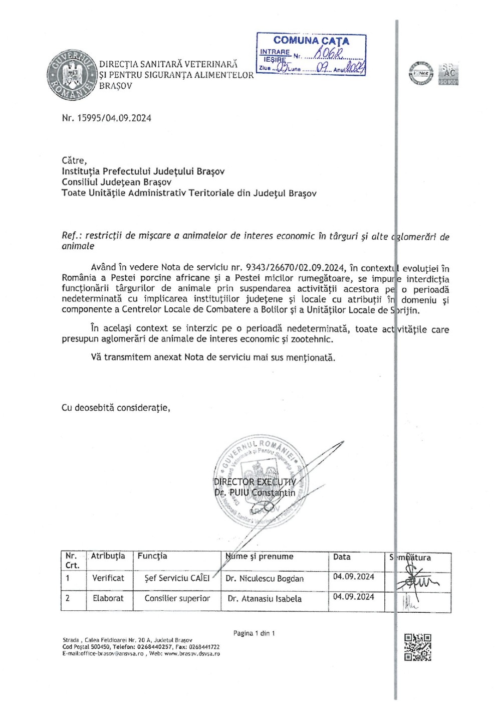 Având în vedere adresa nr. 15995/04.09.2024 emisă de DIRECȚIA SANITARĂ VETERINARĂ ȘI PENTRU SIGURANȚA ALIMENTELOR BRAȘOV, în contextul evoluției în România a Pestei porcine africane și a Pestei micilor rumegătoare, se interzice organizarea târgurilor de animale în COMUNA CAȚA pe o perioadă nedeterminată.