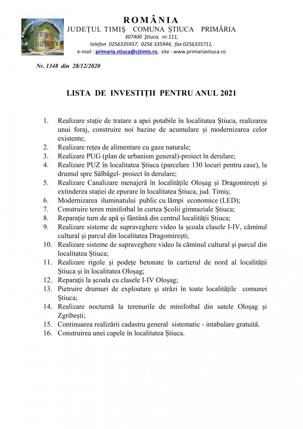 LISTA DE INVESTIȚII PENTRU ANUL 2021