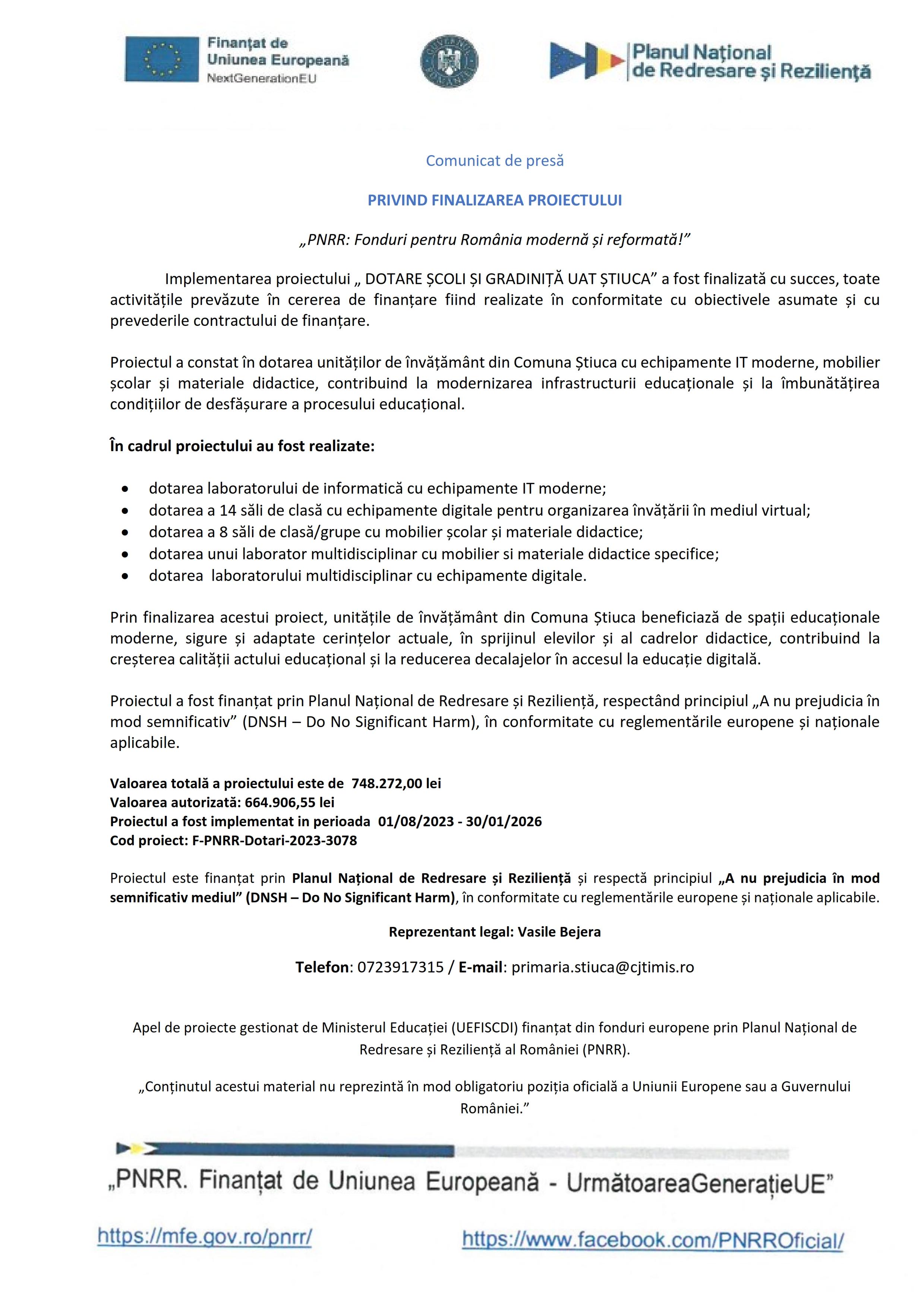 PRIVIND FINALIZAREA PROIECTULUI „PNRR: Fonduri pentru România modernă și reformată!”